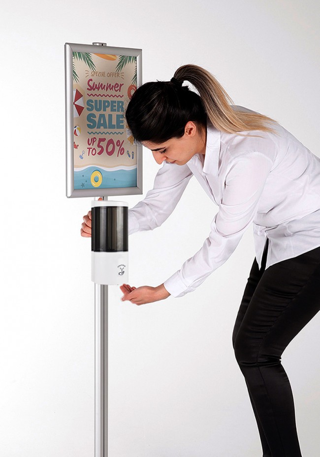 Infoständer mit Plakathalter, Spender 500ml mit Sensor für Hygienemittelfel 806 für DIN A4, A3 oder A2 Plakate