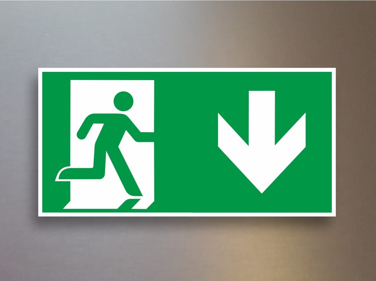 Aufkleber Selbstklebefolie mit weißen Symbolen zur Klebemontage. Wenn keine Sicherheitsbeleuchtung vorhanden ist wird eine nachleuchtende Kennzeichnung gemäß ASR A1.3 zur Pflicht.