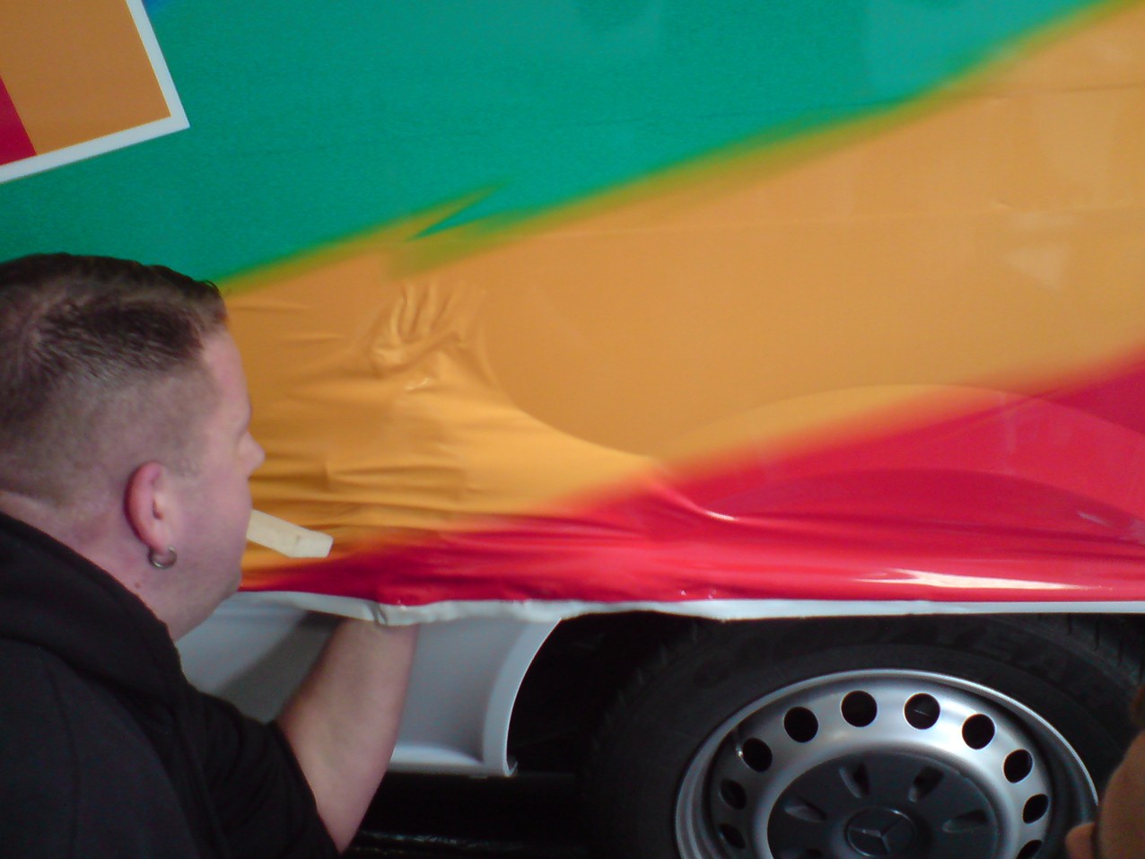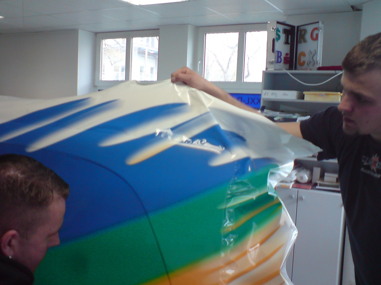 • Aufkleber auf Fahrzeugen mit starke Wölbungen, Sicken, Nahezu blasenfreie Verarbeitung durch Mikrokanäle