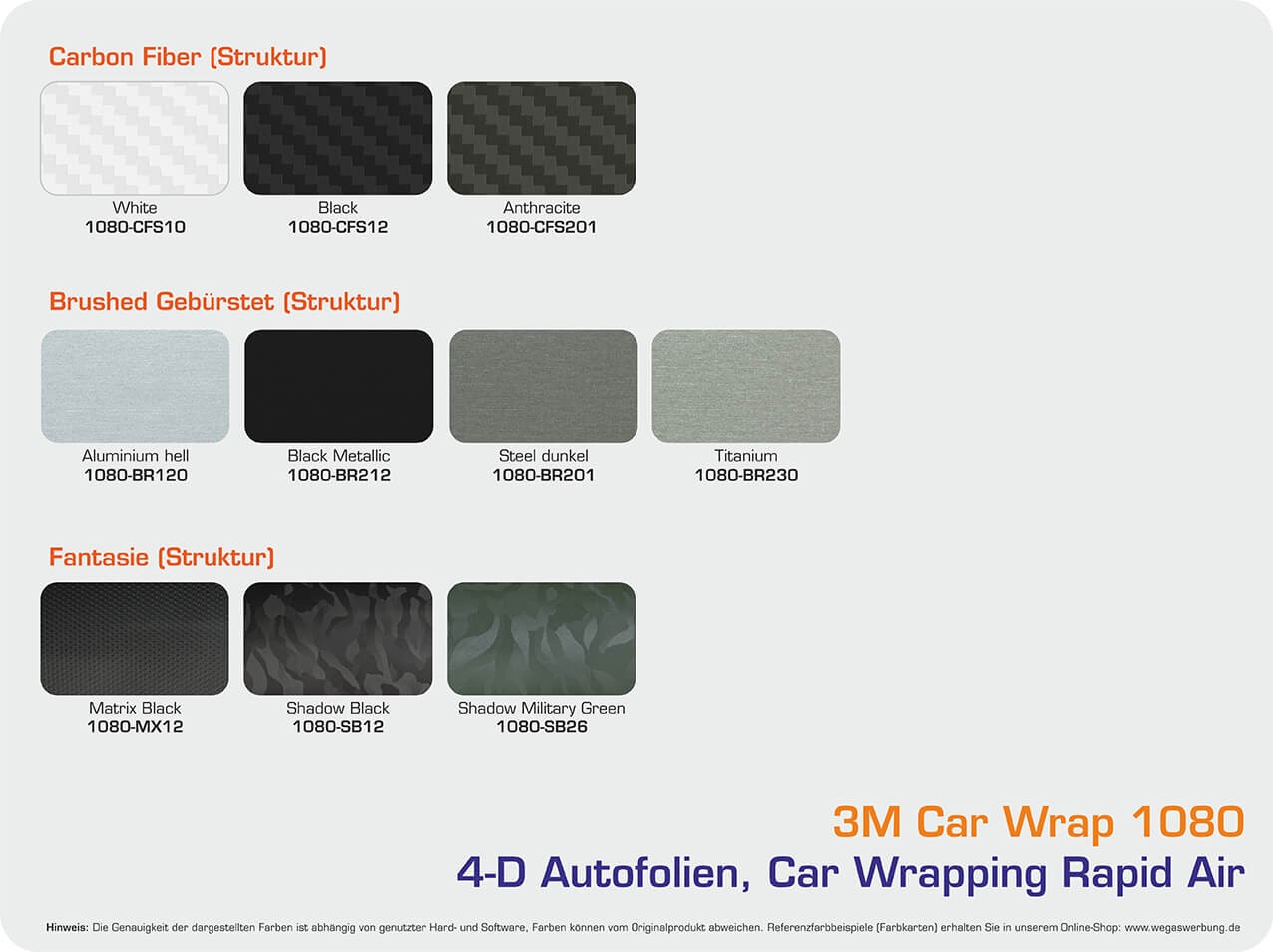 • Premium Wrapping Folie von 3M™ (Deutschland), Serie 2080 von 3M Wrap Film mit Luftkanäle (Rapid Air), zweischichtig gegossene PVC-Folie