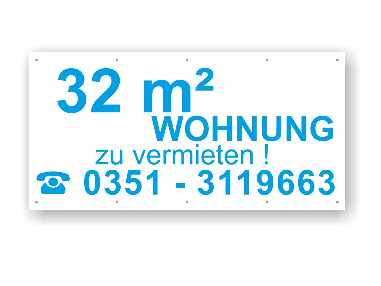• PVC Werbeplane, geöst aller 50 cm und gesäumt als Vermietungsplane, Verkaufsplane beschriftet mit Ihrem Text