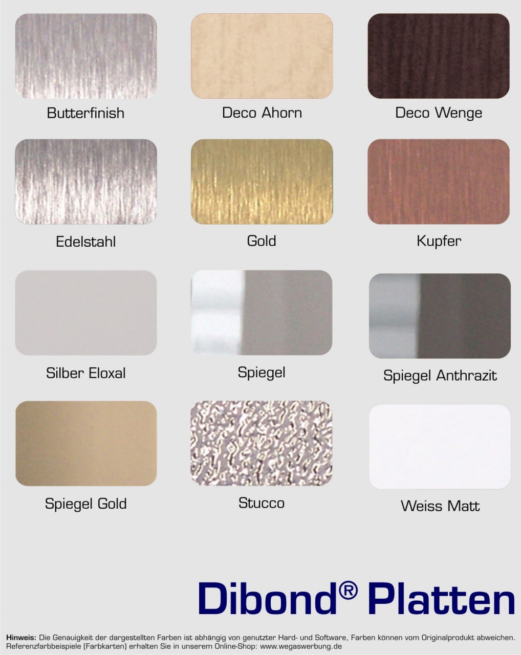 • DIBOND 3 mm, Butlerfinish in vielen Farben: Alu Look, Gold Look, Edelstahl Look, Kupfer Look, Weißaluminium, Platinweiß, Hellelfenbein, Verkehrsgelb, Verkehrsrot, Tiefschwarz,