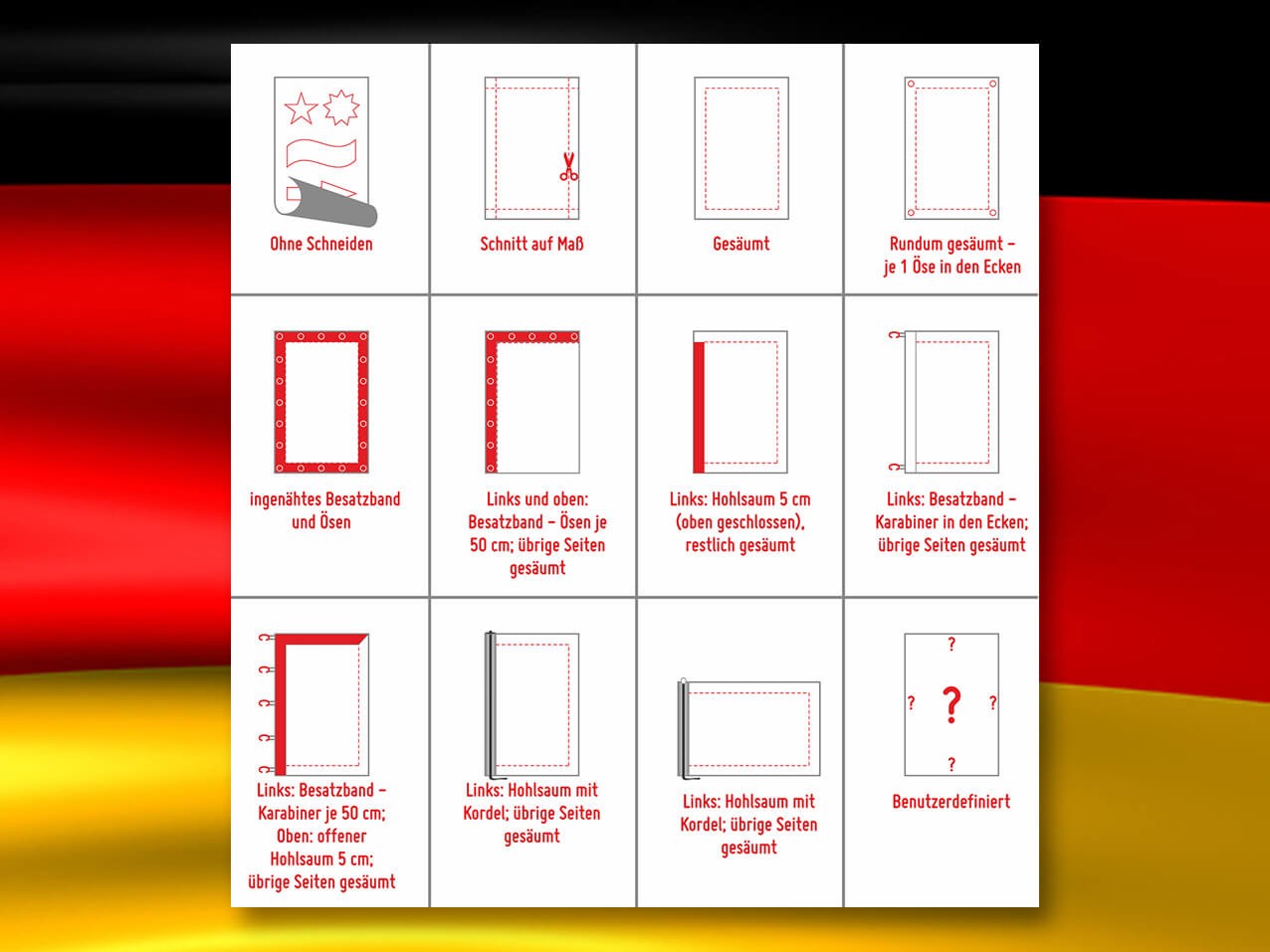 • viele Konfektionierungen, wie mit Saum oder ohne, Ösen, Karabiner, Hohlsaum für Hissfahnen mit Ausleger zur Auswahl