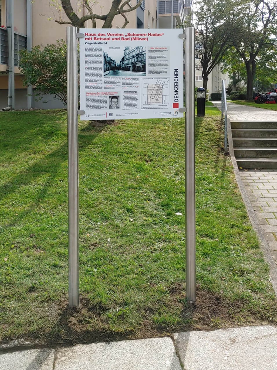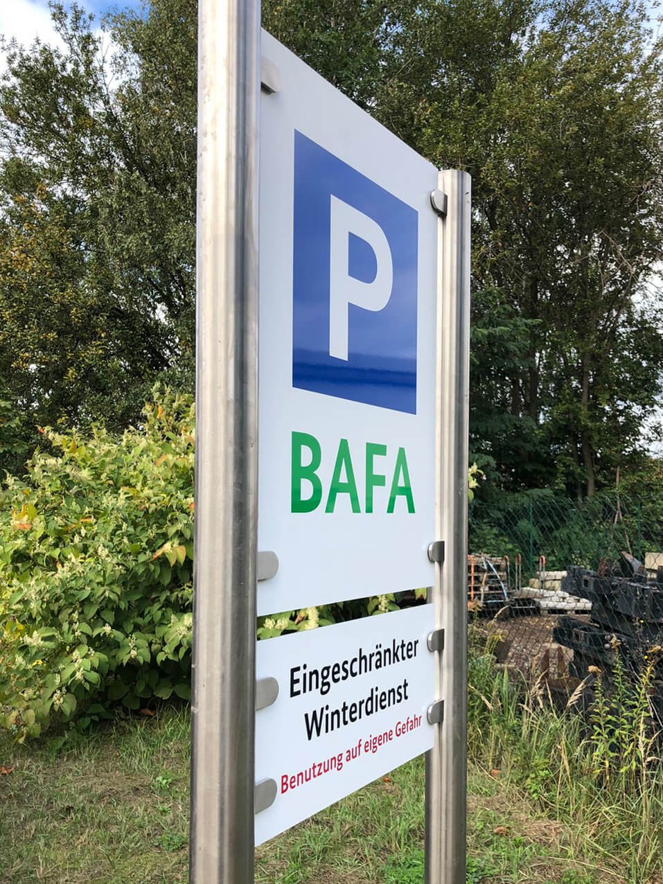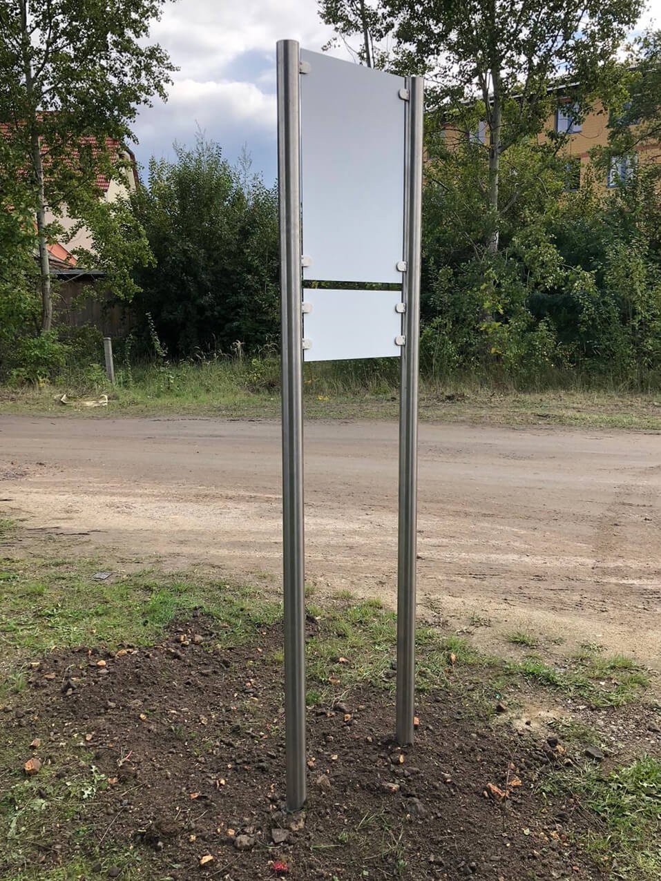 • einfache Gestellmontage mit beiliegenden Schrauben aufmontiert oder einbetoniert, Schilder einfach aufschrauben