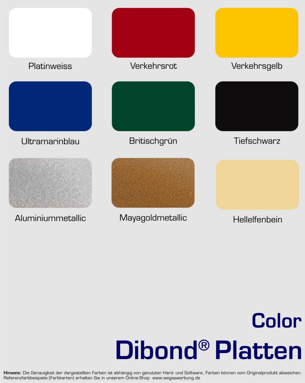 • DIBOND 3 mm Color in vielen Farben: Weißaluminium, Platinweiß, Hellelfenbein, Verkehrsgelb, Verkehrsrot, Tiefschwarz, Ultramarienblau, Britisch Green