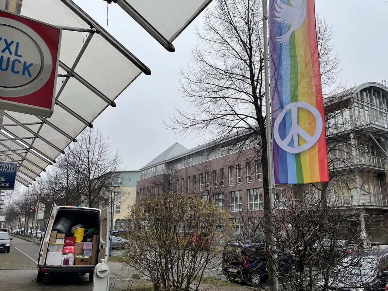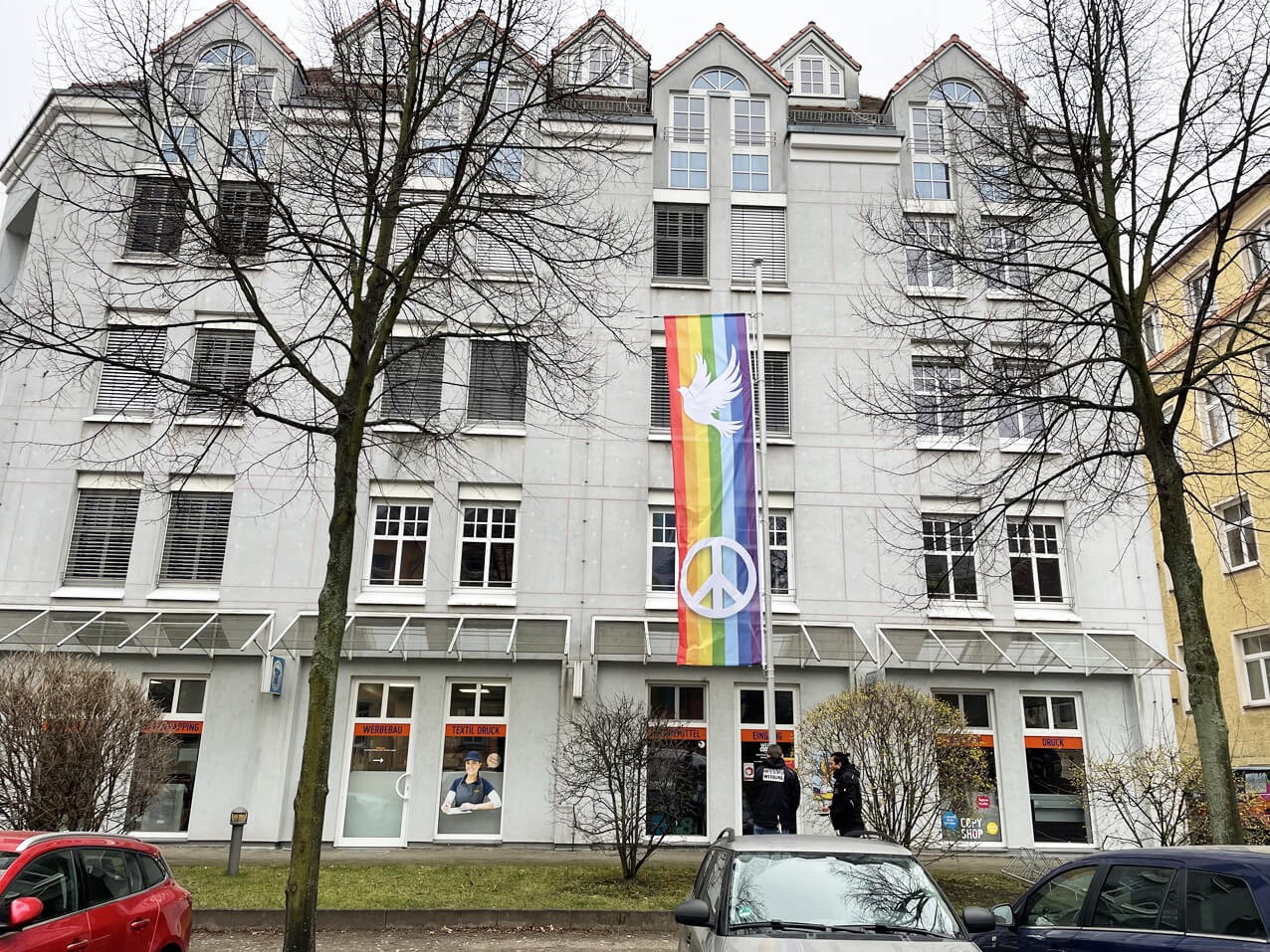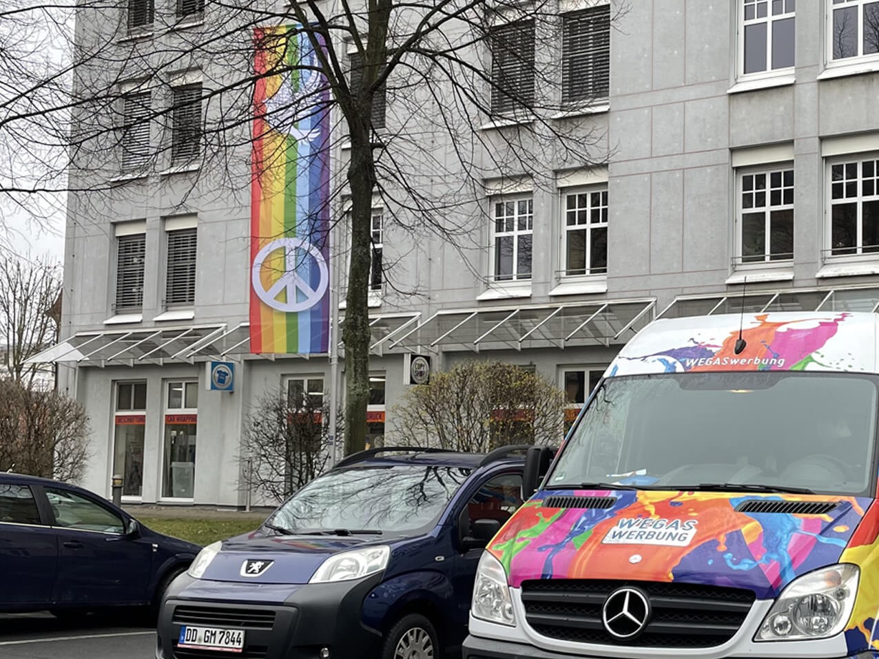 Fahne, Flagge Regenbogen Frieden Peace Logo für Alle, Friedenszeichen in allen Größen inkl Druck