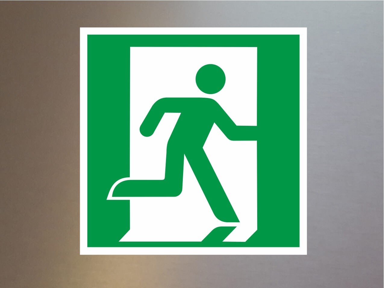Aufkleber Selbstklebefolie mit weißen Symbolen zur Klebemontage. Wenn keine Sicherheitsbeleuchtung vorhanden ist wird eine nachleuchtende Kennzeichnung gemäß ASR A1.3 zur Pflicht.